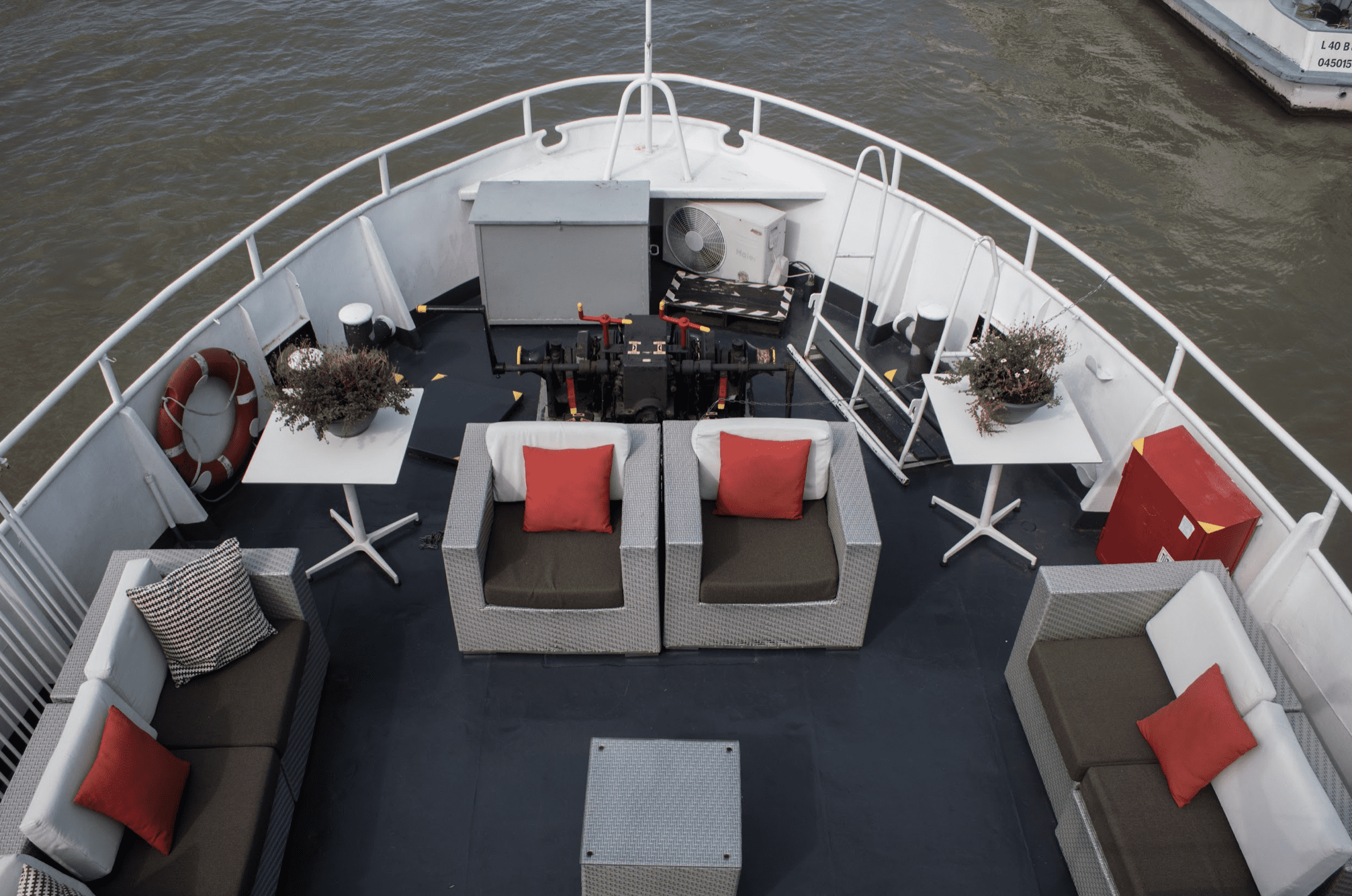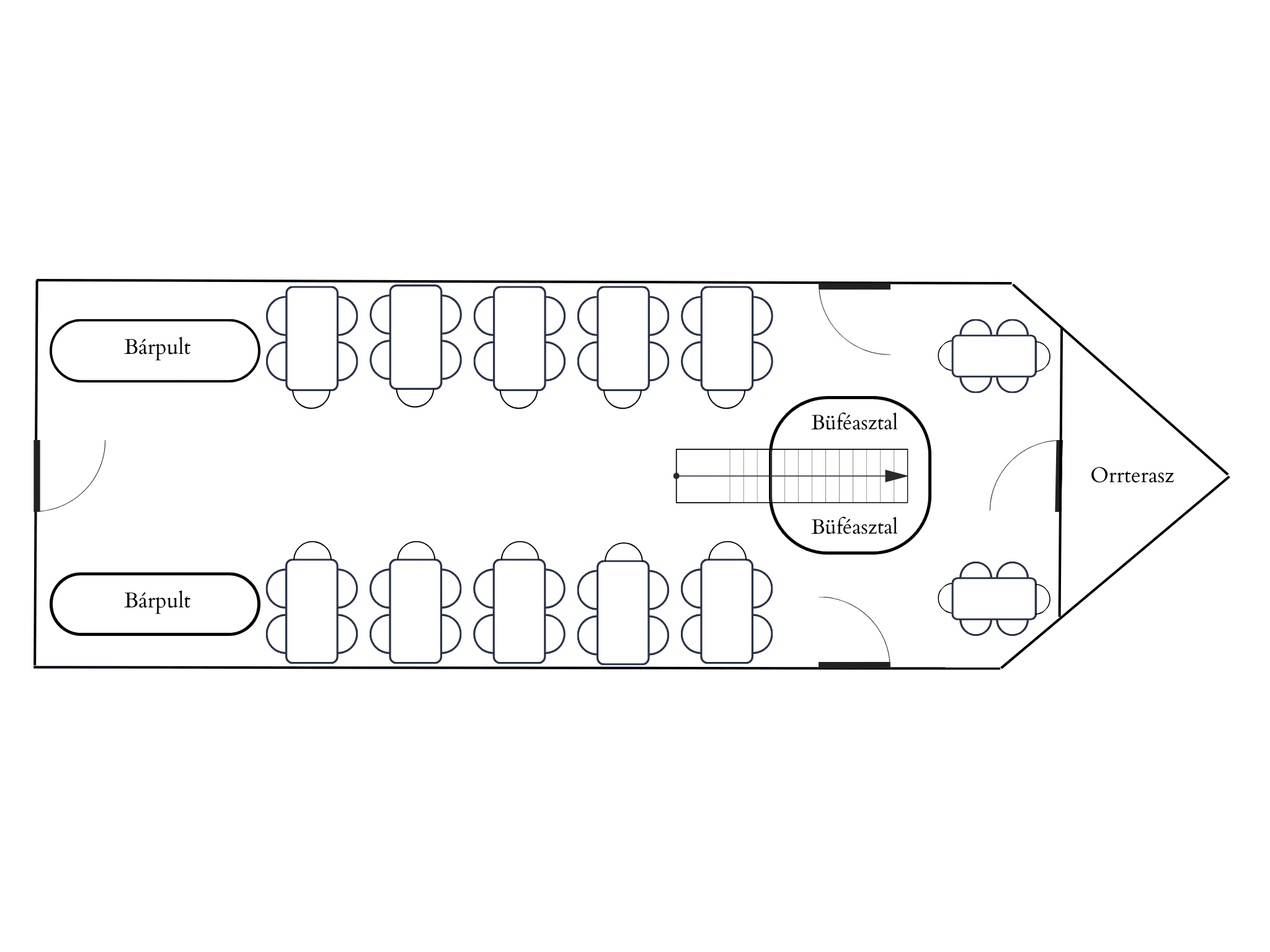 Újonnan kialakított belső terének meghatározó eleme a fehér márvány borítású büfé- és bárpult. A hajófenékben kialakítható akár casino, ruhatár vagy játszósarok is.